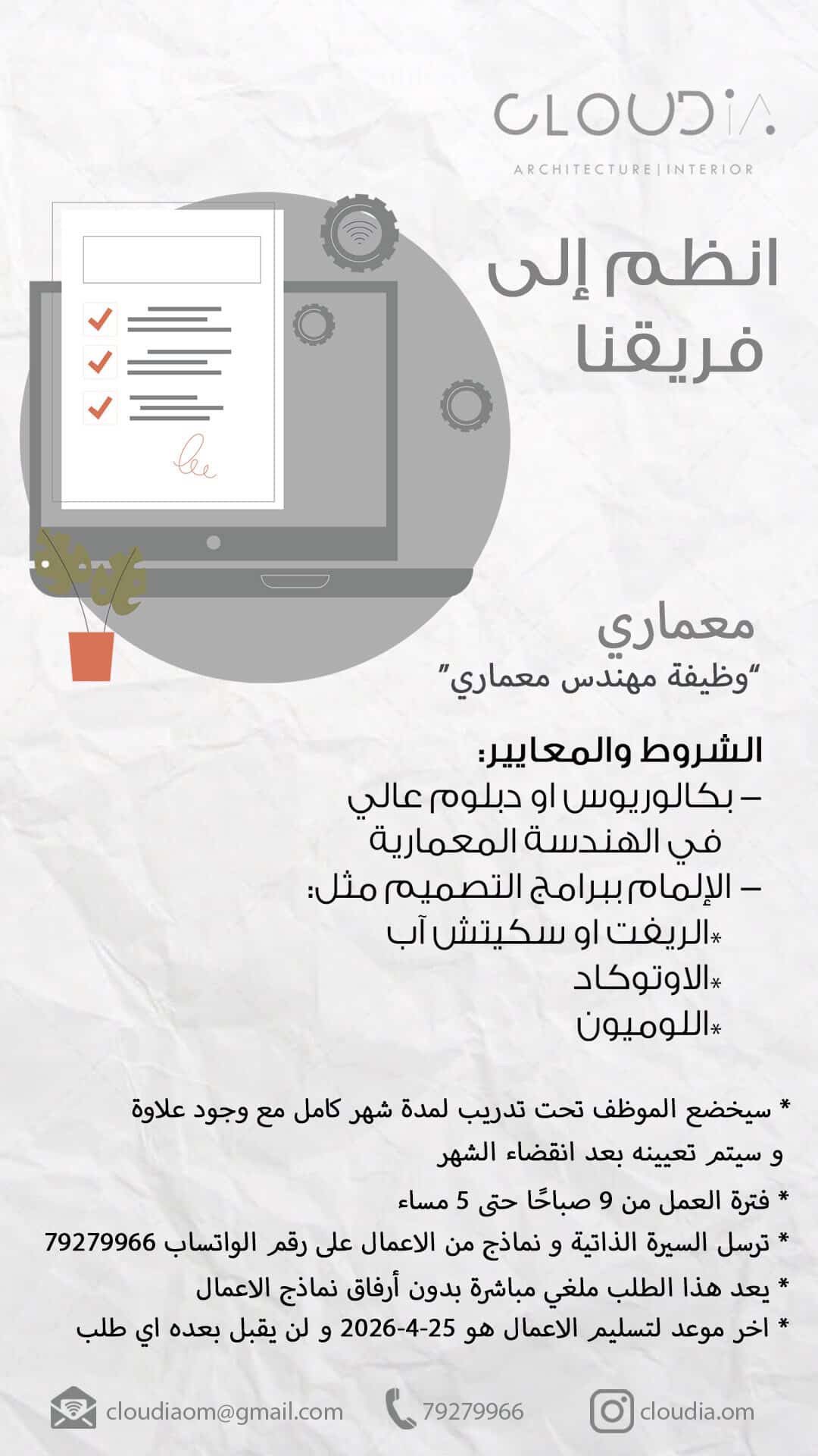 مكتب كلاوديا للتصميم الداخلي والمعماري في العذيبة - وظيفة شاغرة ( مهندس معماري )