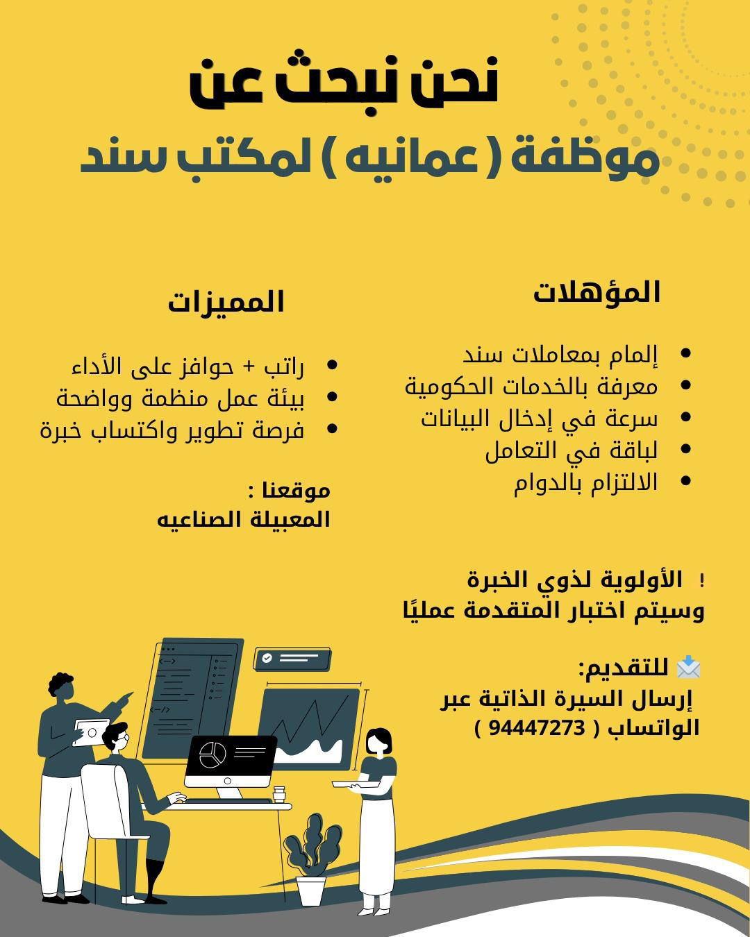 مكتب سند للخدمات في المعبيلة الصناعية - وظيفة شاغرة ( موظفة )
