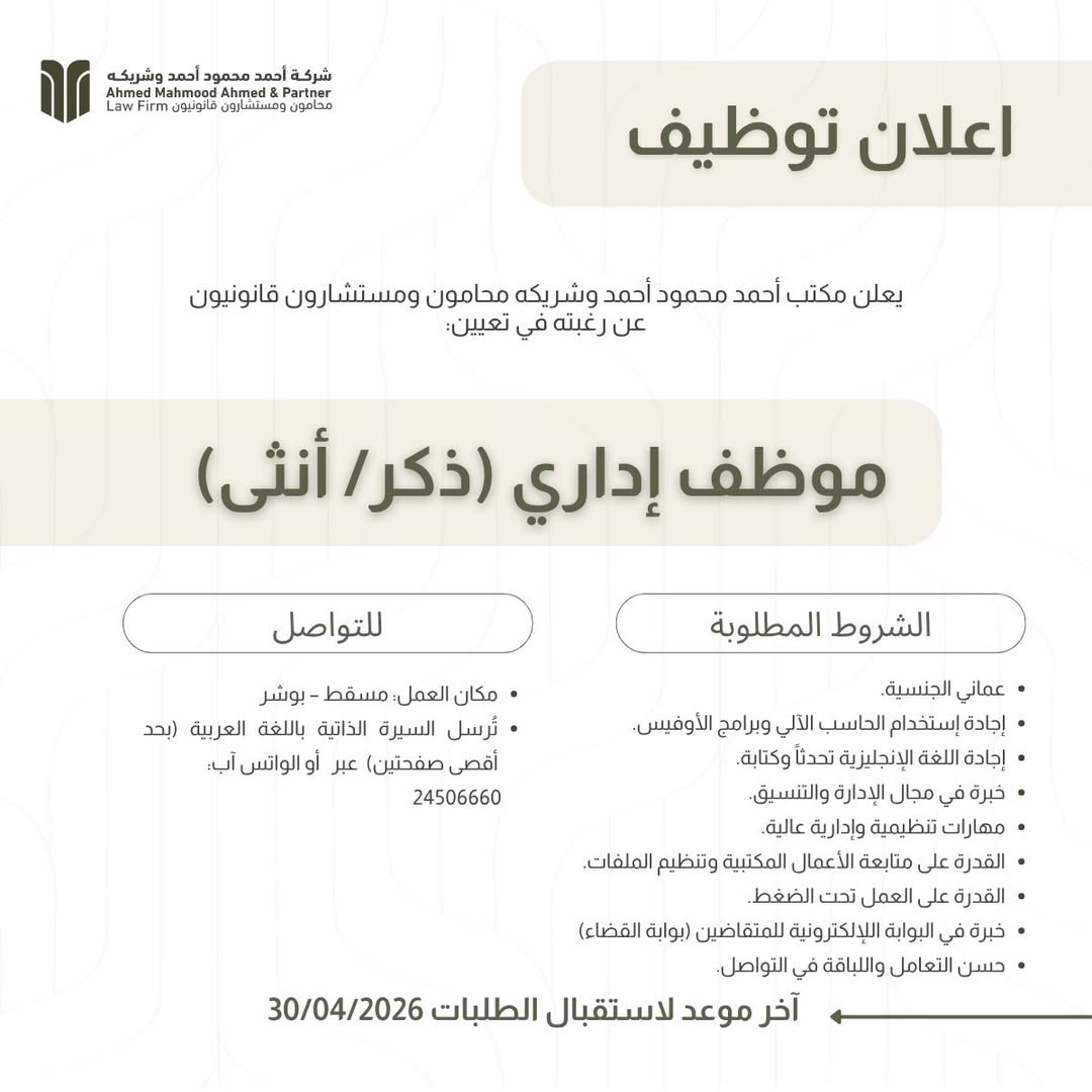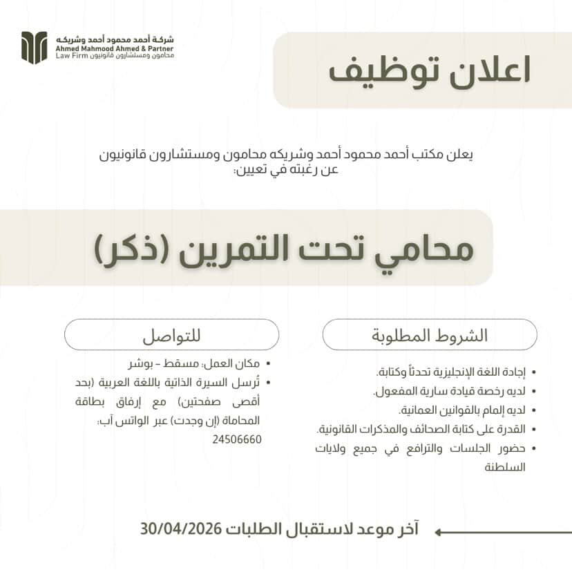 مكتب أحمد محمود أحمد وشريكه محامون ومستشارون قانونيون في بوشر - وظيفة شاغرة ( محامي تحت التمرين + موظف اداري )