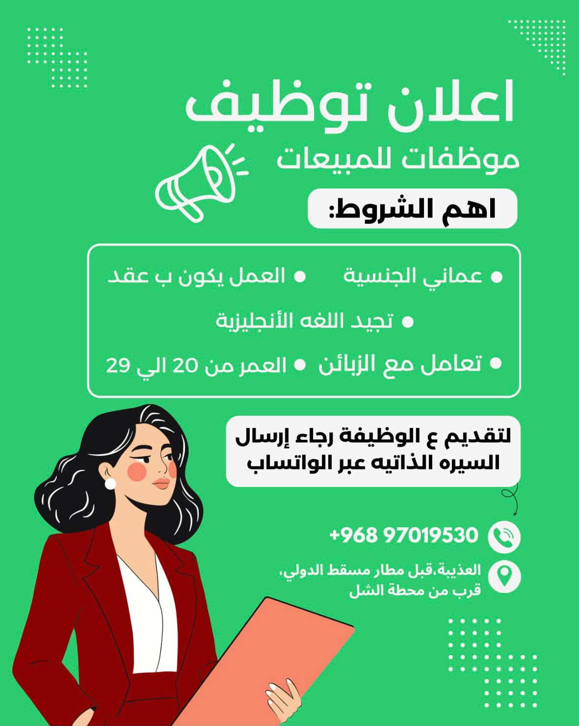 شركة رائدة في مسقط - وظيفة شاغرة ( موظفات مبيعات )