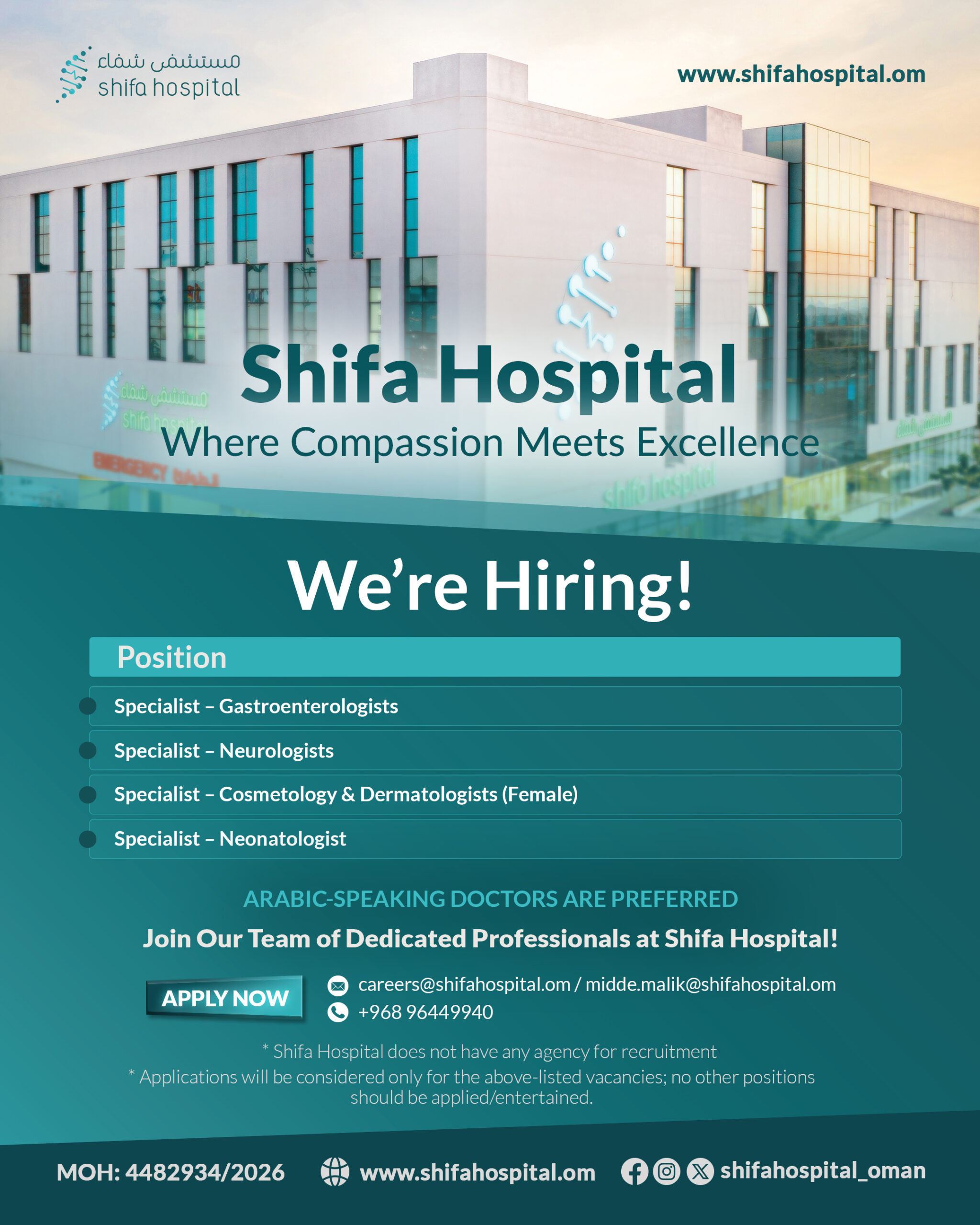 ارسل السيرة الذاتية على الايميل midde.malik@shifahospital.om careers@shifahospital.om