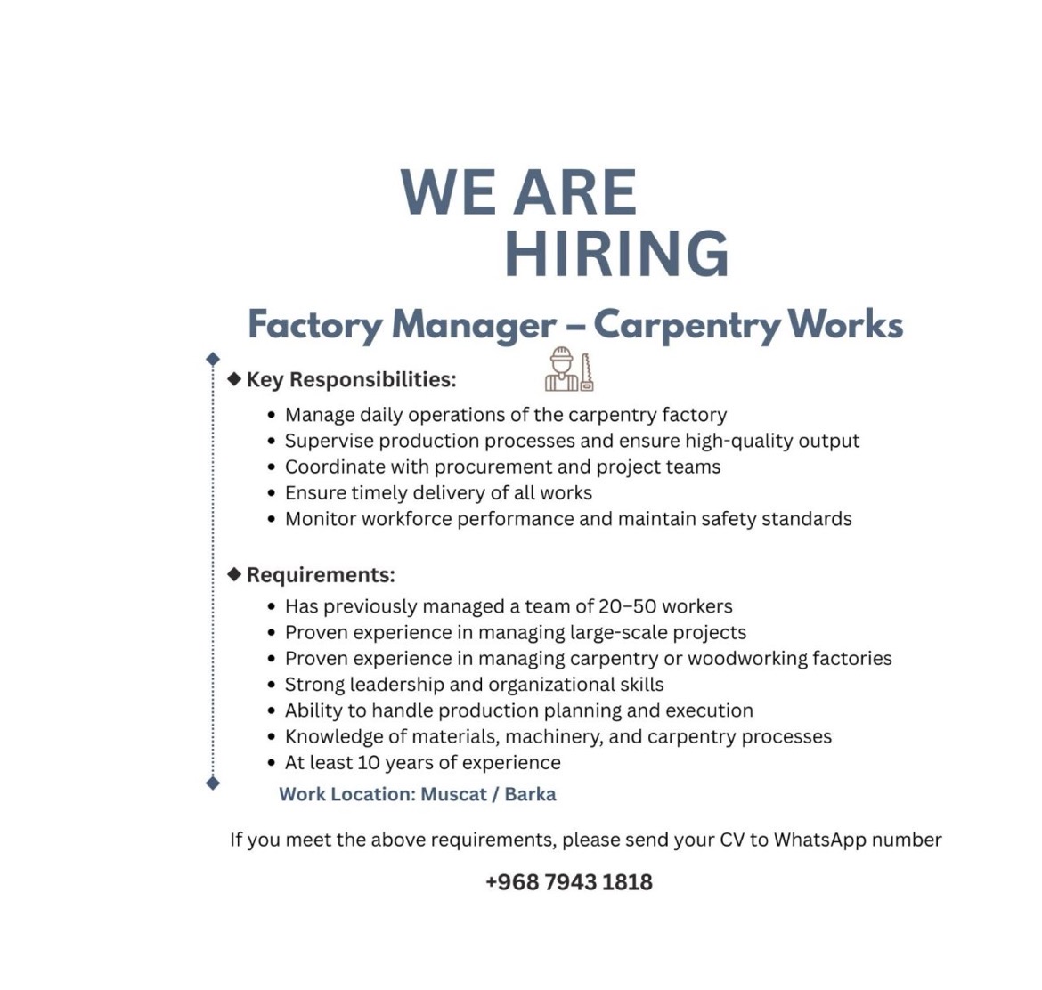 شركة رائدة في مسقط - وظيفة شاغرة ( Factory Manager - Carpentry Works )