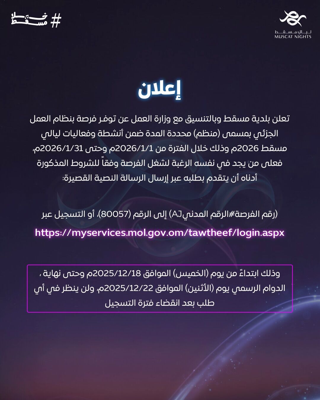 بلدية مسقط - وظائف شاغرة بنظام العمل الجزئي بمسمى ( منظم )