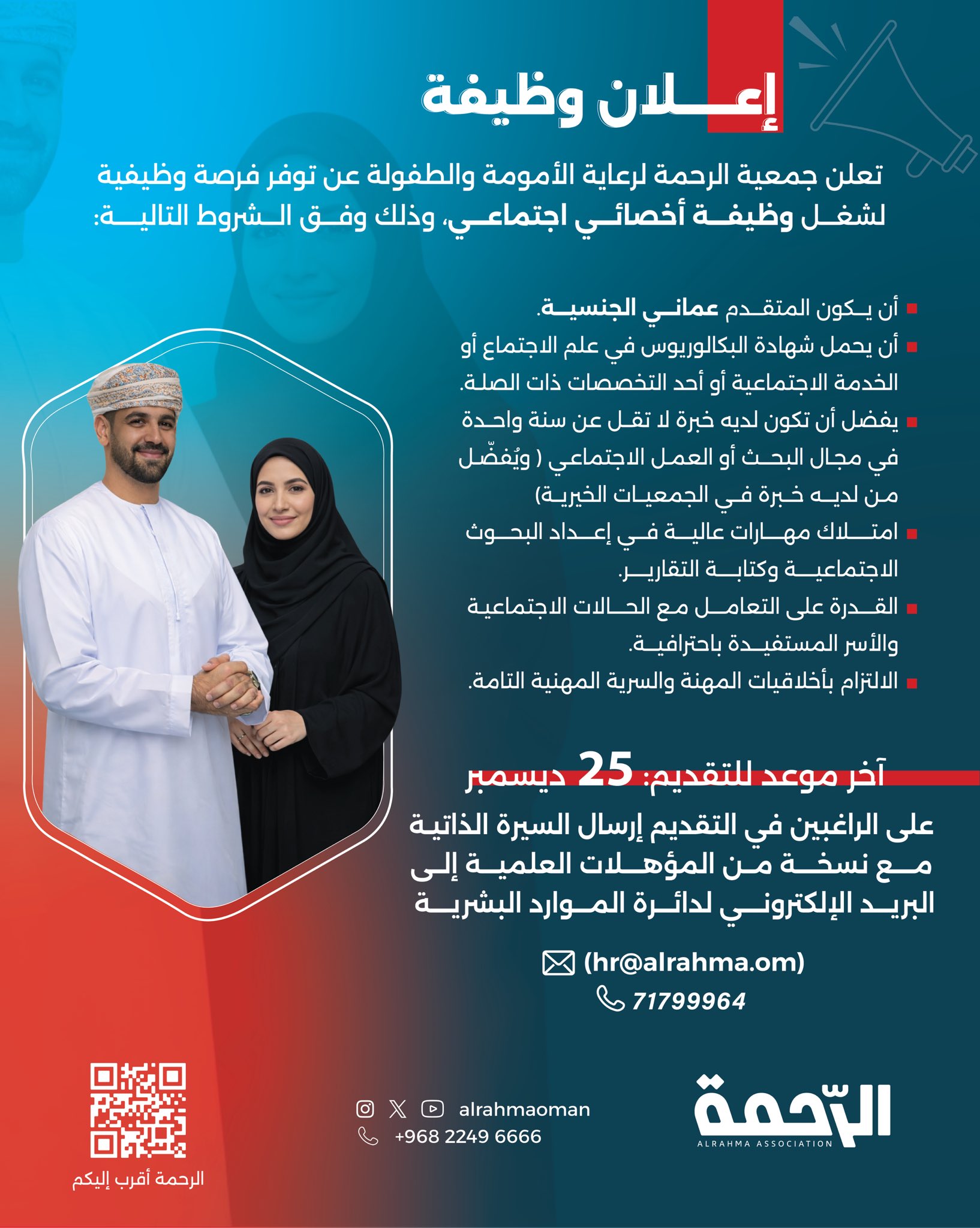 جمعية الرحمة لرعاية الأمومة والطفولة - وظيفة شاغرة ( أخصائي اجتماعي )