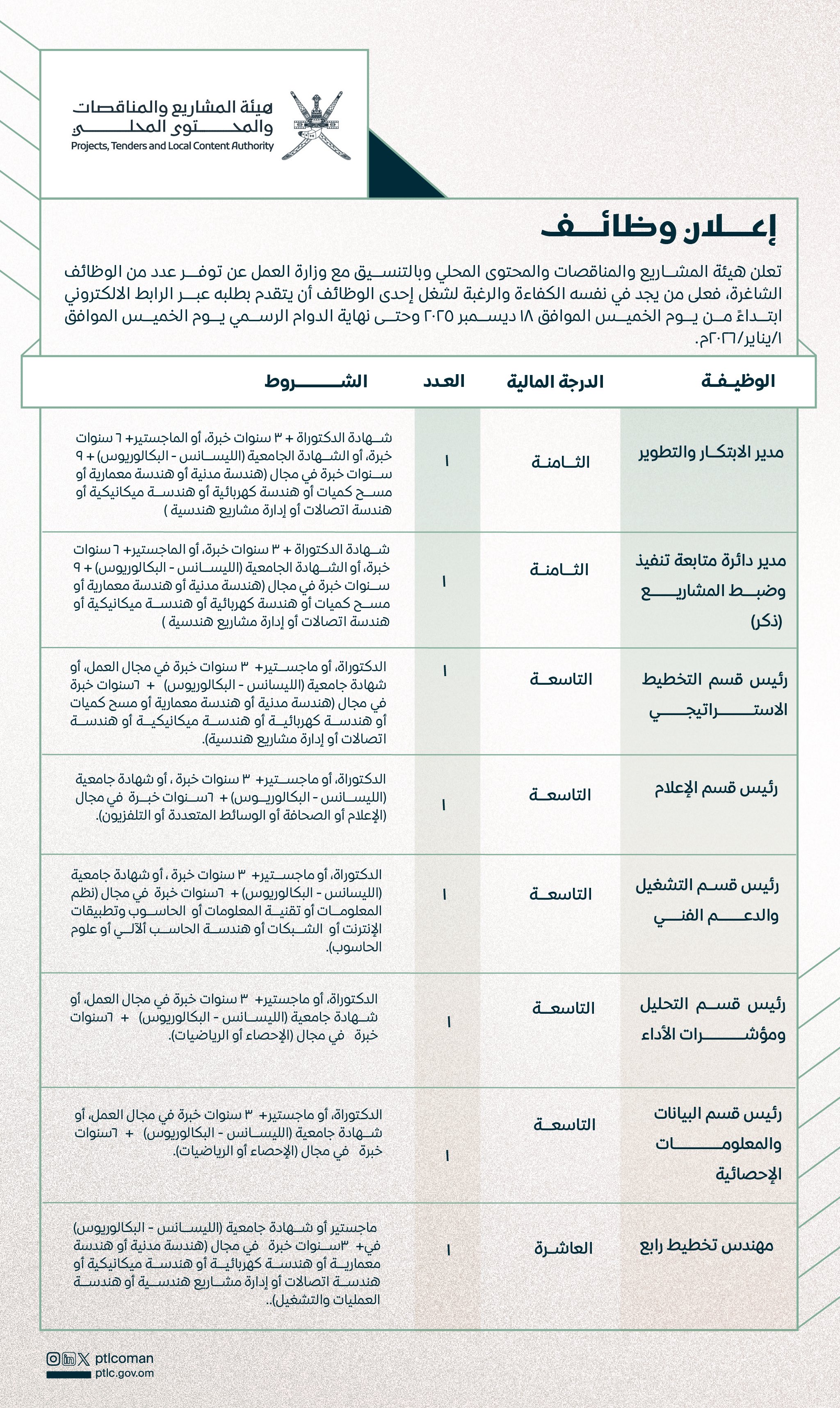 هيئة المشاريع والمناقصات والمحتوى المحلي - توفر 8 وظائف شاغرة