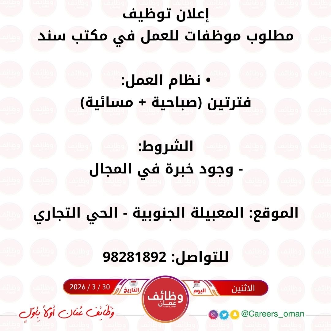 مكتب سند في المعبيلة الجنوبية - وظيفة شاغرة ( موظفة )