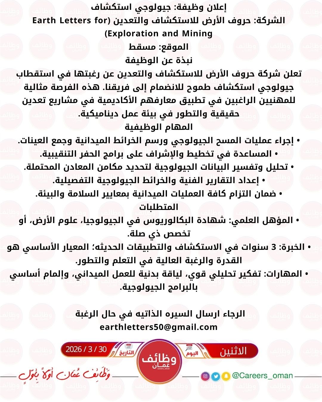 شركة حروف الأرض للاستكشاف والتعدين في مسقط - وظيفة شاغرة ( جيولوجي استكشاف )