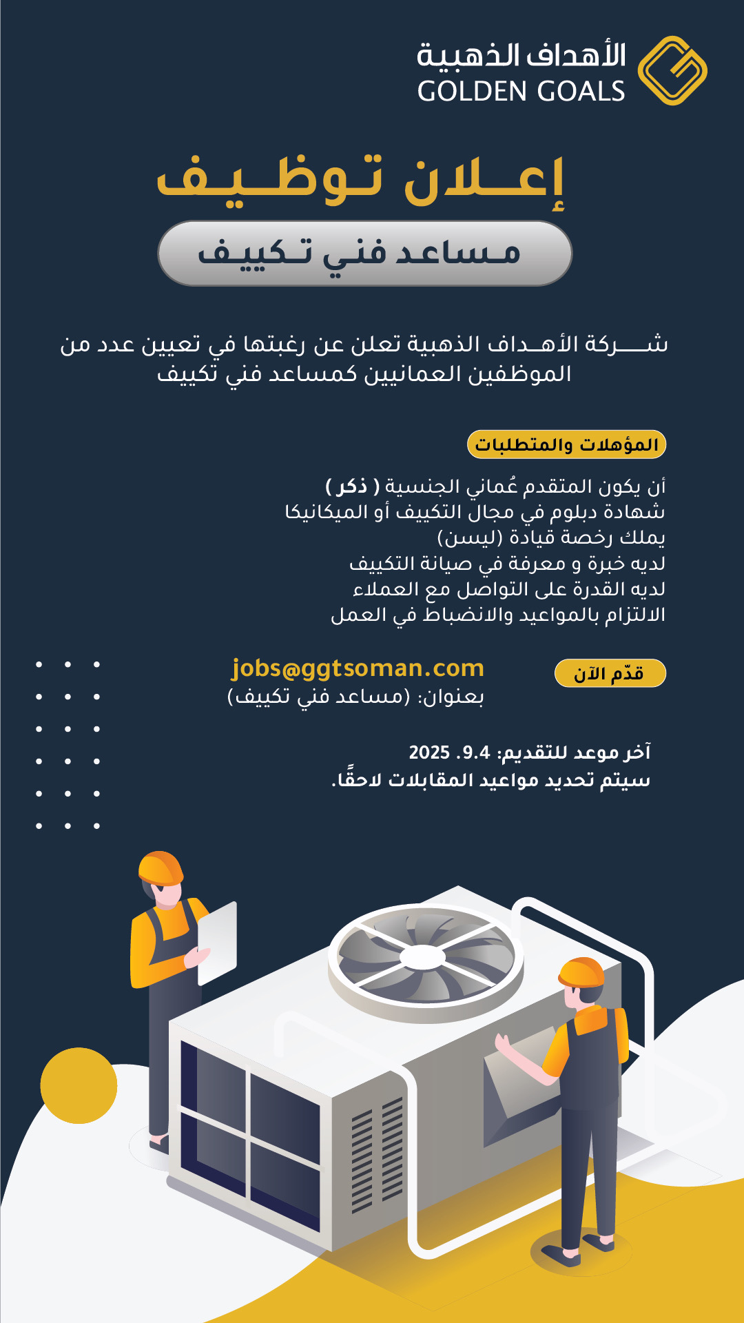 شركة الأهداف الذهبية - وظيفة شاغرة ( مساعد فني تكييف )