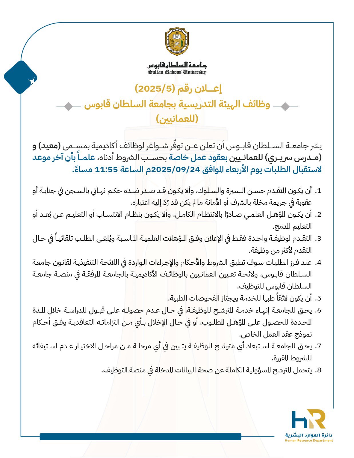 جامعة السلطان قابوس - توفّر شواغر لوظائف أكاديمية بمسمى ( معيد) و(مدرس سريري) للعمانيين بعقود عمل خاصة