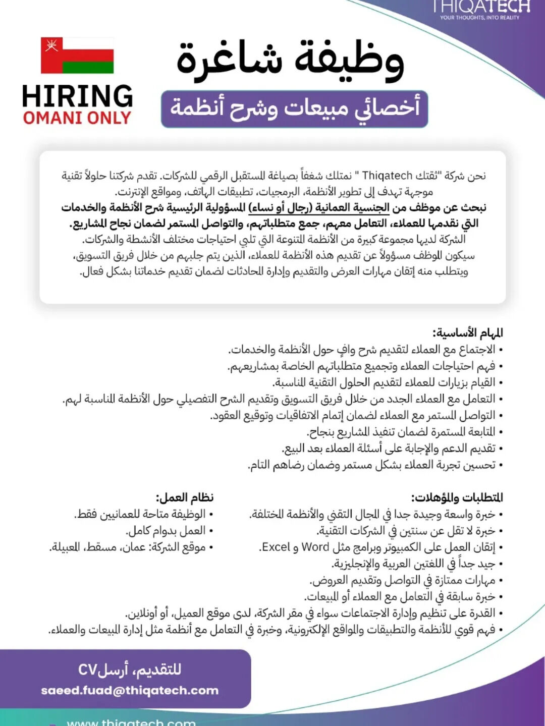 شركة ثقتك في المعبيلة - وظيفة شاغرة ( أخصائي مبيعات وشرح أنظمة )