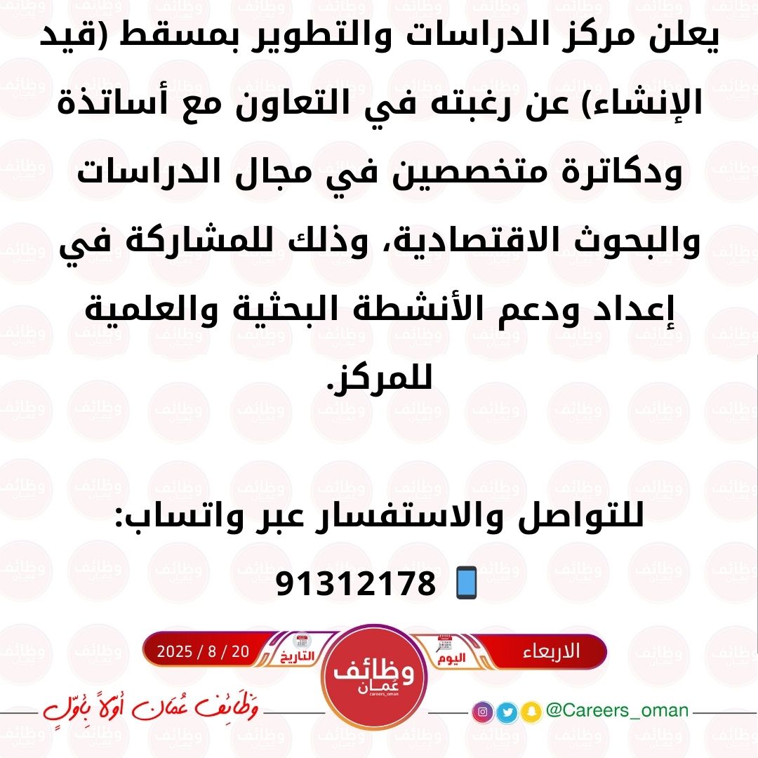 مركز للدراسات والتطوير بمسقط - فرص شاغرة بالتعاون ( اساتذة ودكاترة متخصصين بمجال الدراسات والبحوث الاقتصادية )