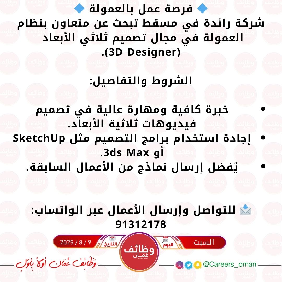 شركة رائدة في مسقط - وظيفة شاغرة بالعمولة ( مصمم ثلاثي الأبعاد )
