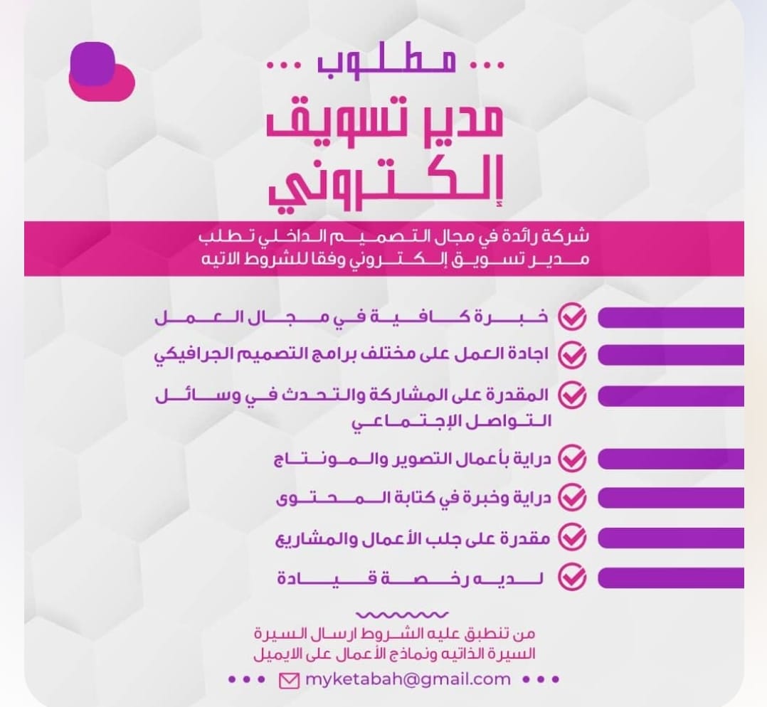شركة رائدة في مجال التصميم الداخلي - وظيفة شاغرة ( مدير تسويق إلكتروني )