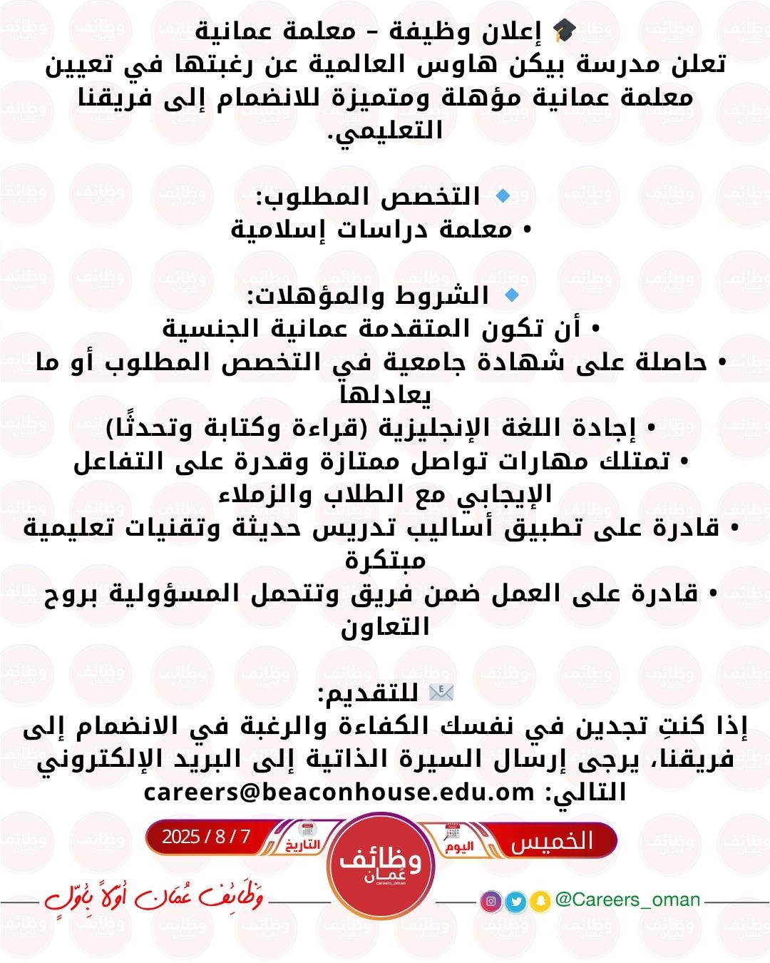 مدرسة بيكن هاوس العالمية - وظيفة شاغرة ( معلمة دراسات إسلامية )