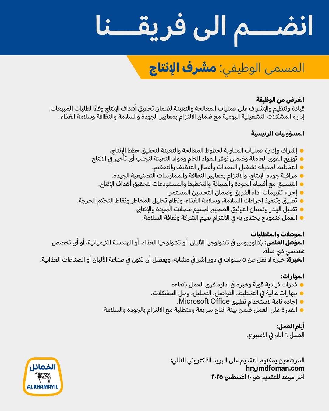 شركة خمائل - وظيفة شاغرة ( مشرف الإنتاج )