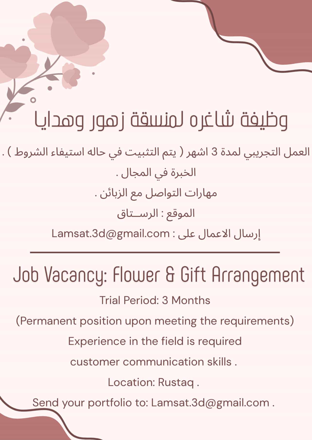 لمسات الفرح لخدمات الأفراح في الرستاق - وظيفة شاغرة ( منسقة زهور وهدايا )