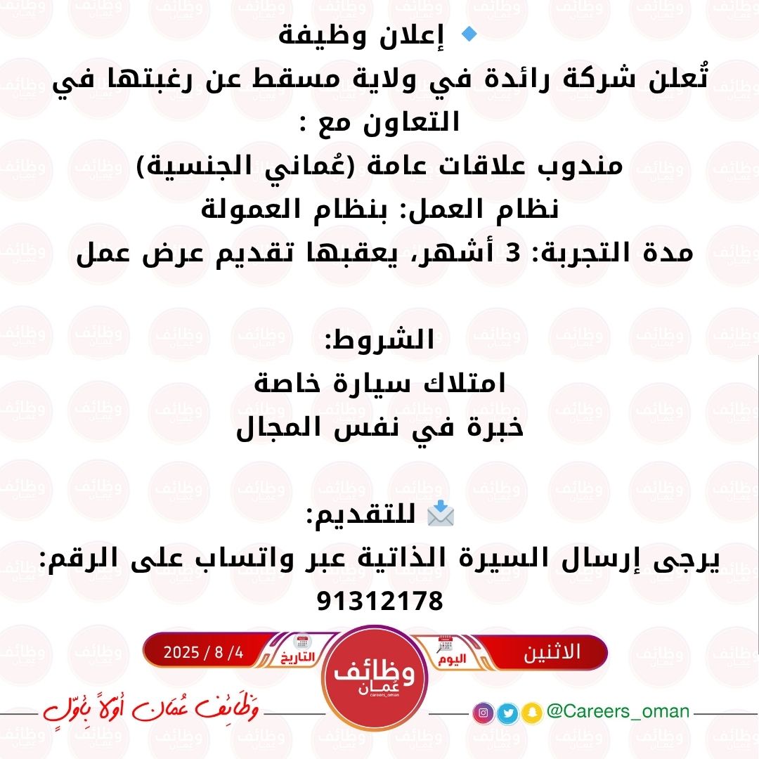 شركة رائدة في مسقط - وظيفة شاغرة بالعمولة ( مندوب علاقات عامة )
