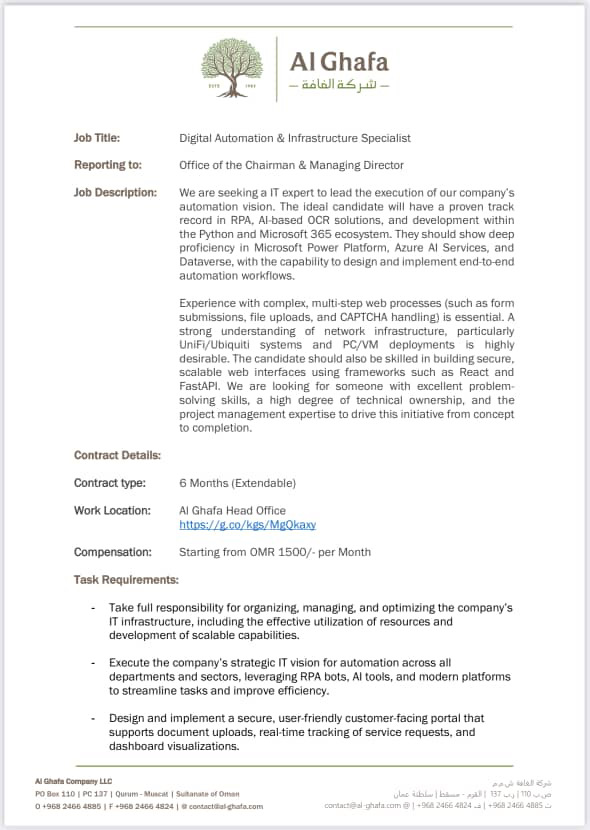 شركة الغافة - وظيفة شاغرة ( Digital Automation & Infrastructure Specialist )