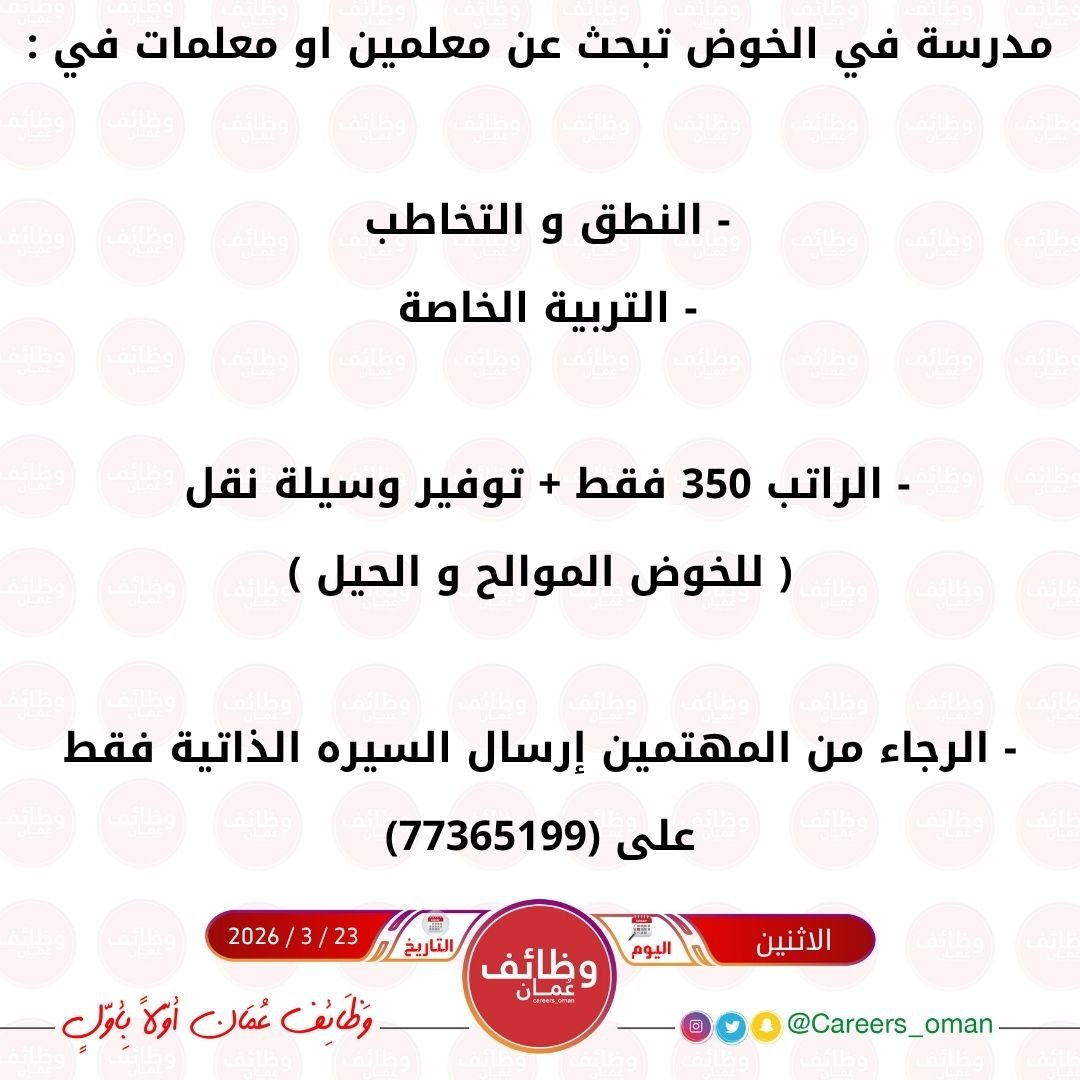 مدرسة في الخوض - فرص شاغرة ( النطق والتخاطب + التربية الخاصة )
