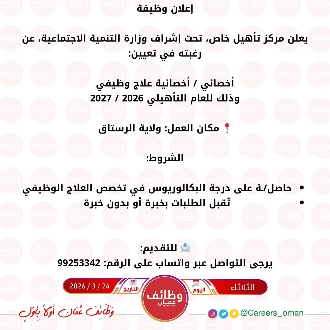 مركز تأهيل خاص في الرستاق - وظيفة شاغرة ( أخصائي / أخصائية علاج وظيفي )