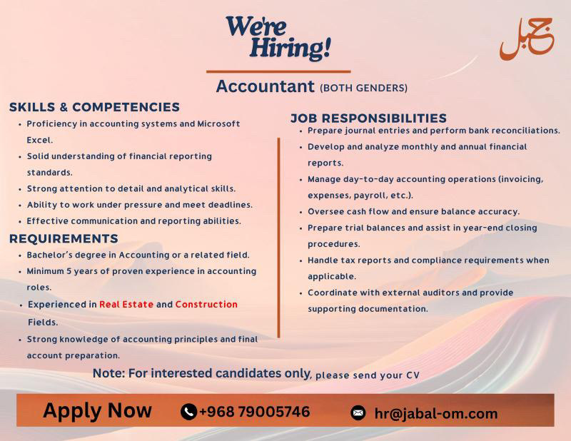 شركة جبل العقارية في الخوض - وظيفة شاغرة ( محاسب )