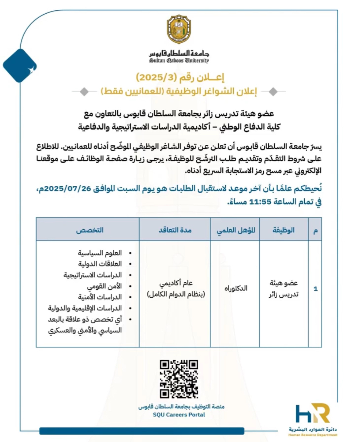 جامعة السلطان قابوس - وظيفة شاغرة ( عضو هيئة تدريس زائر )