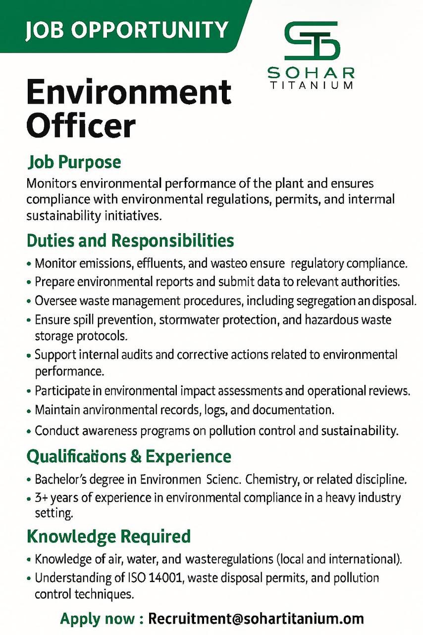 شركة صحار تيتانيوم - وظيفة شاغرة ( Environment Officer )