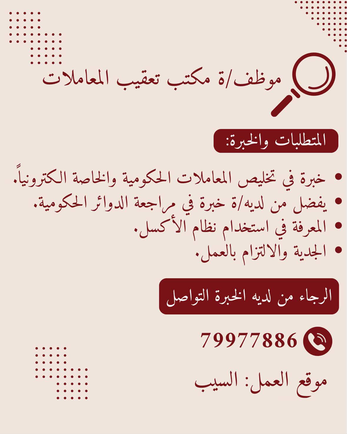 مكتب تعقيب المعاملات في السيب - وظيفة شاغرة ( موظف / موظفة )