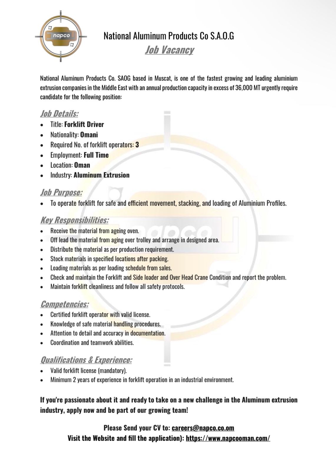 الشركة الوطنية لمنتجات الألمنيوم - وظيفة شاغرة ( Forklift Driver )