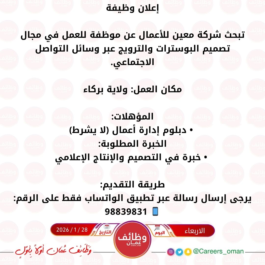 شركة معين للأعمال في بركاء - وظيفة شاغرة ( موظفة للعمل في مجال تصميم البوسترات والترويج عبر وسائل التواصل الاجتماعي )