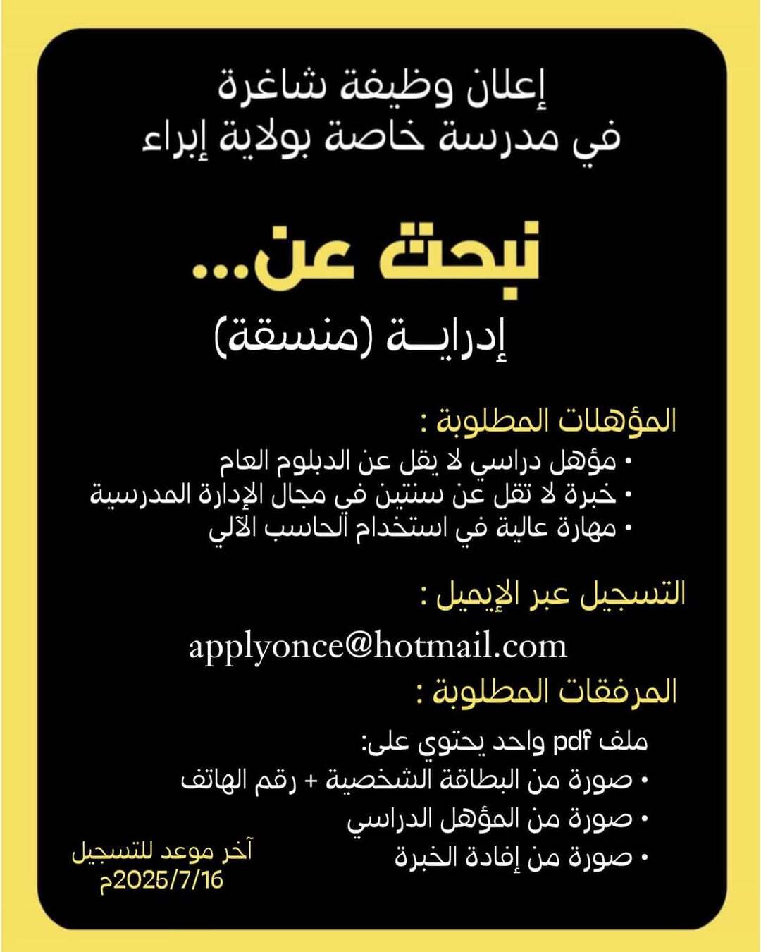 مدرسة خاصة بولاية إبراء - وظيفة شاغرة ( إدارية منسقة )