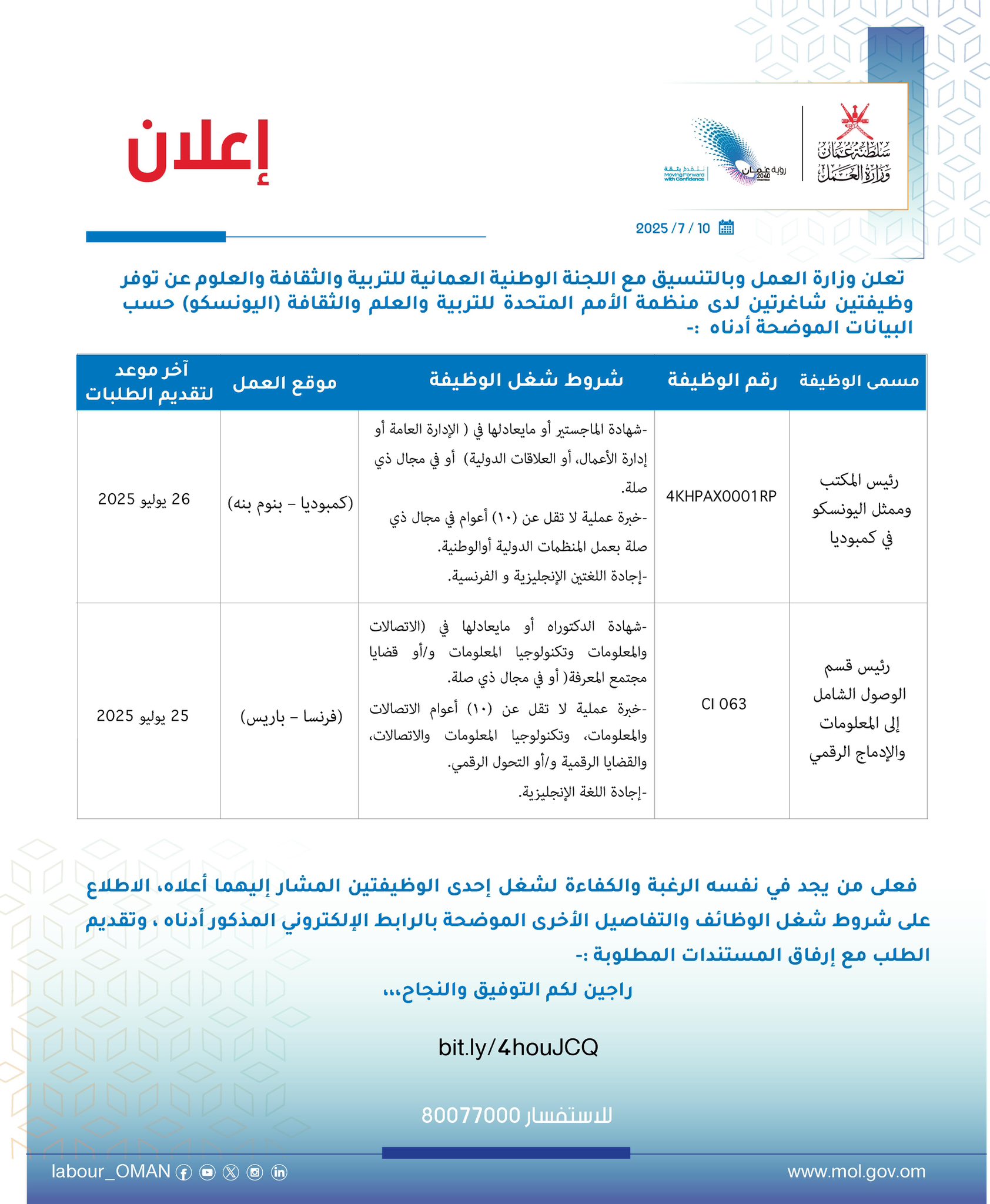 وزارة العمل وبالتنسيق مع اللجنة الوطنية العمانية للتربية والثقافة والعلوم - وظيفتين شاغرتين لدى منظمة (اليونسكو)