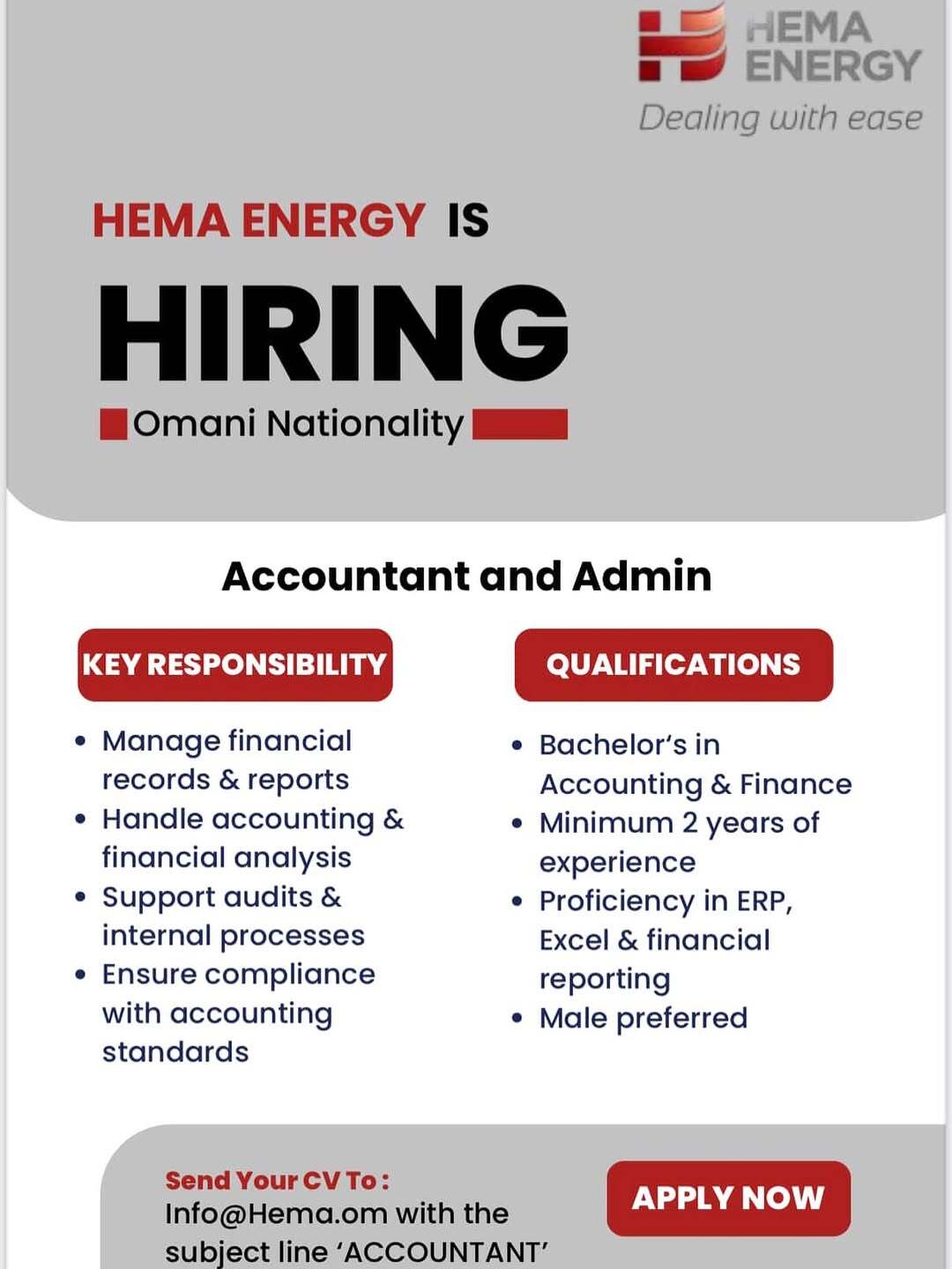 شركة هيما للطاقة - وظيفة شاغرة ( Accountant and Admin )