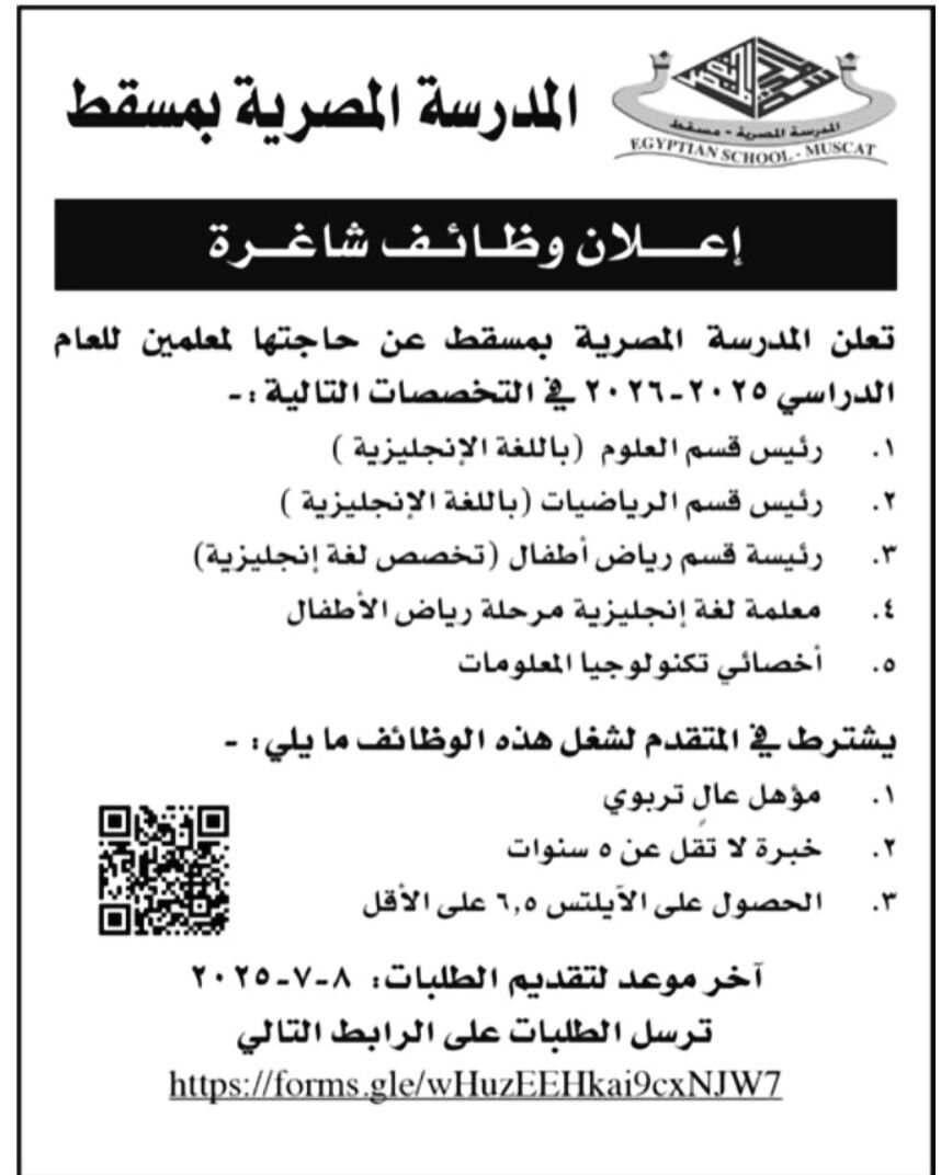 المدرسة المصرية بمسقط - 5 وظائف شاغرة