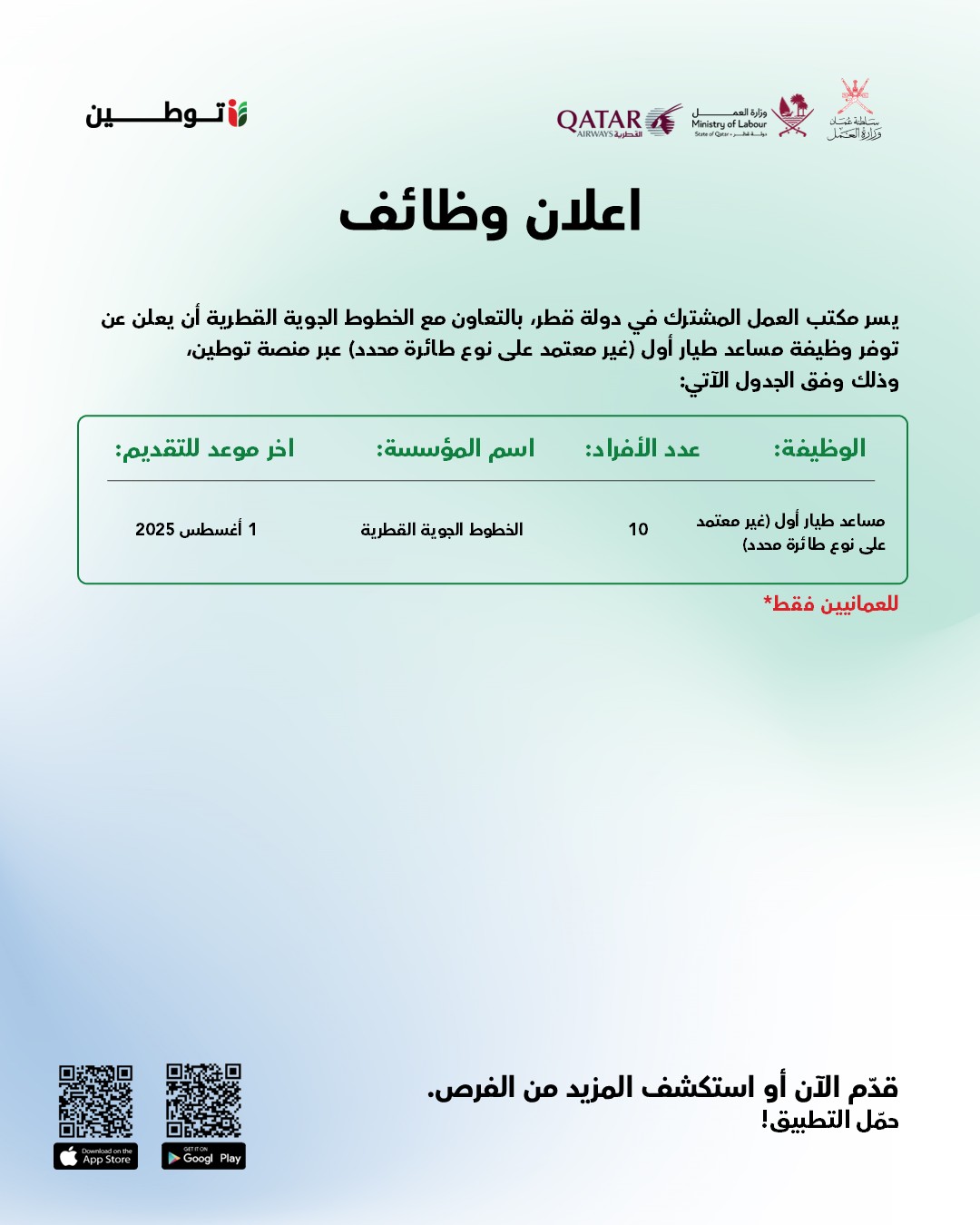 منصة توطين التعاون مع الخطوط الجوية القطرية - توفر وظيفة مساعد طيار أول