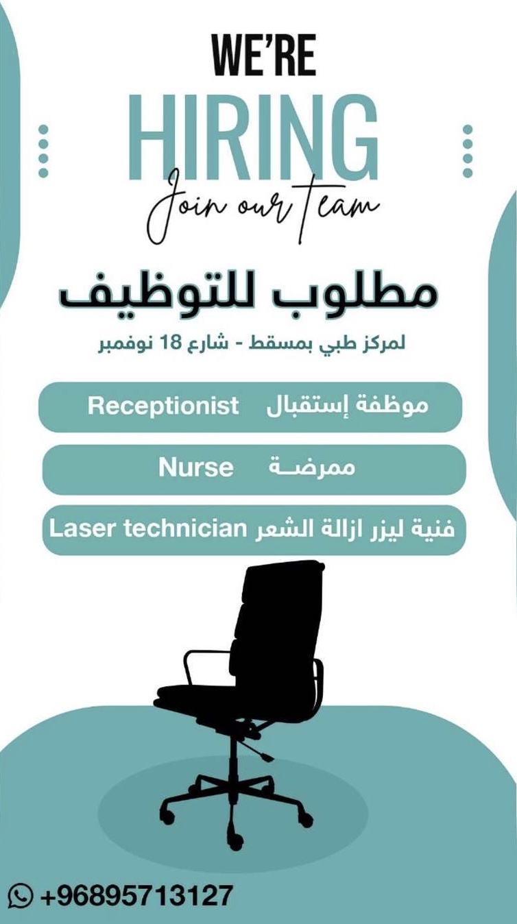 مركز طبي في مسقط - 3 وظائف شاغرة ( موظفة استقبال + ممرضة + فنية ليزر ازالة الشعر )