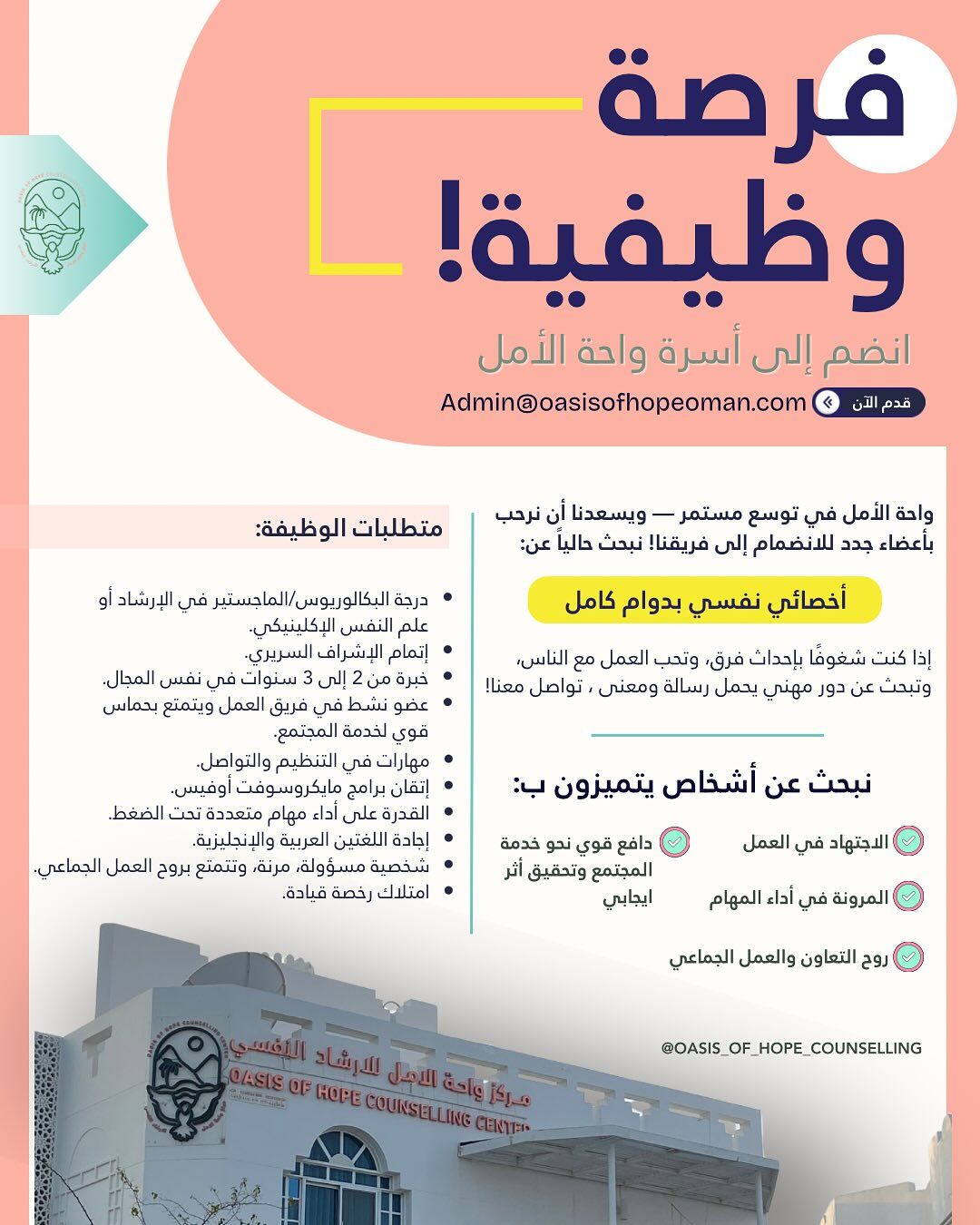مركز واحة الأمل للإرشاد النفسي في مسقط - وظيفة شاغرة ( أخصائي نفسي )