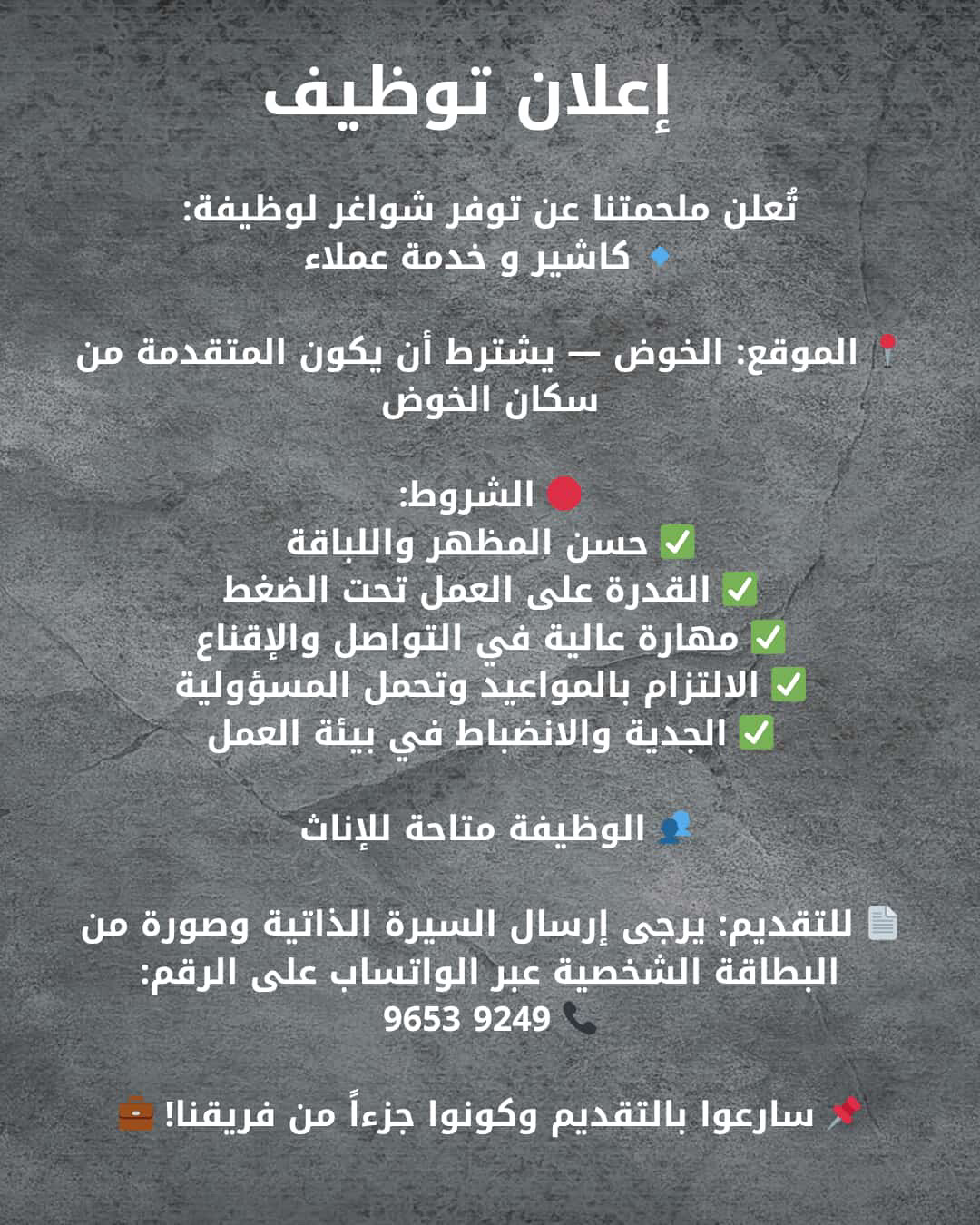 ملحمتنا في الخوض - وظيفة شاغرة ( كاشير وخدمة عملاء )