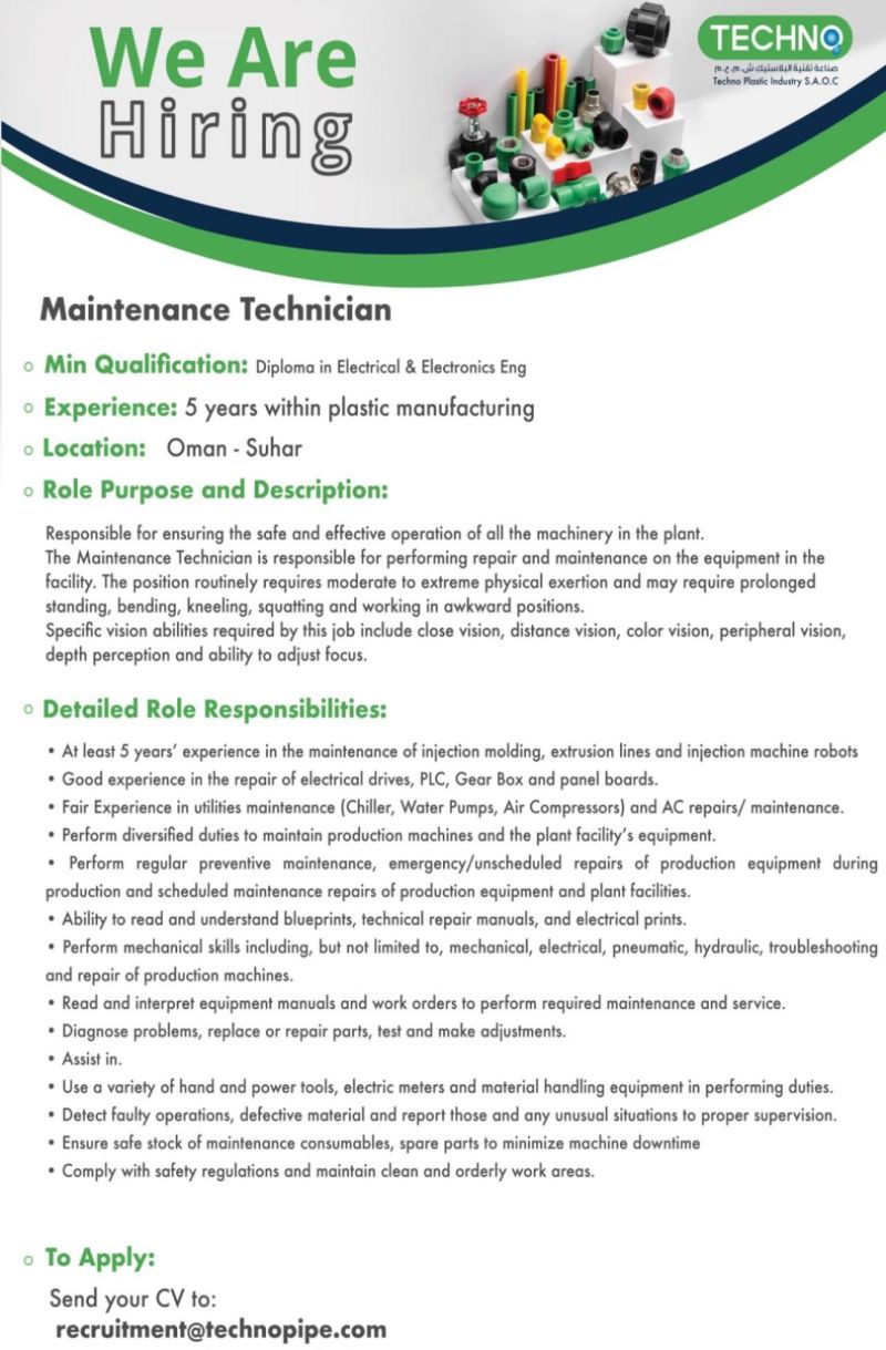 شركة صناعة تقنية البلاستيك في صحار - وظيفة شاغرة ( Maintenance Technician )