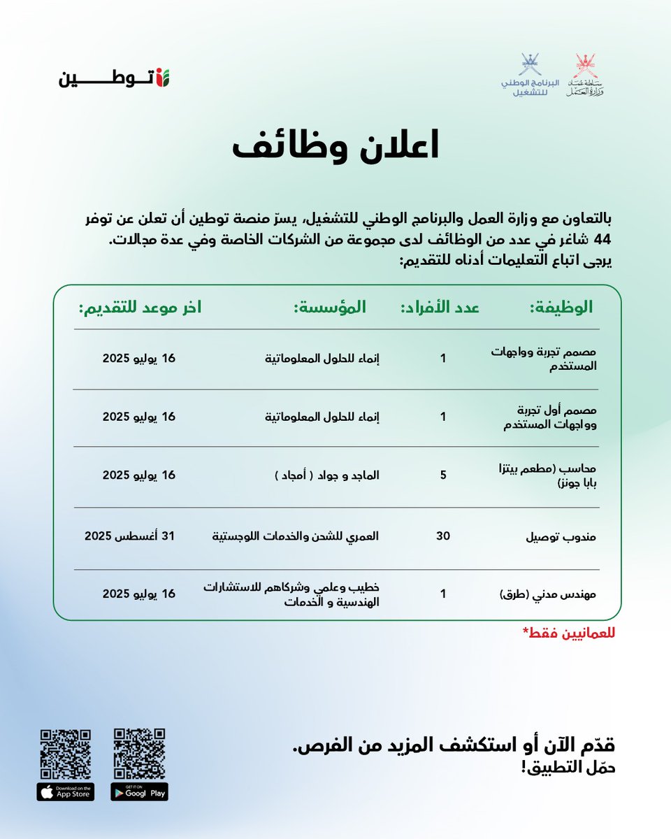 منصة توطين - توفر 44 شاغر في عدد من الوظائف لدى مجموعة من الشركات الخاصة وفي عدة مجالات