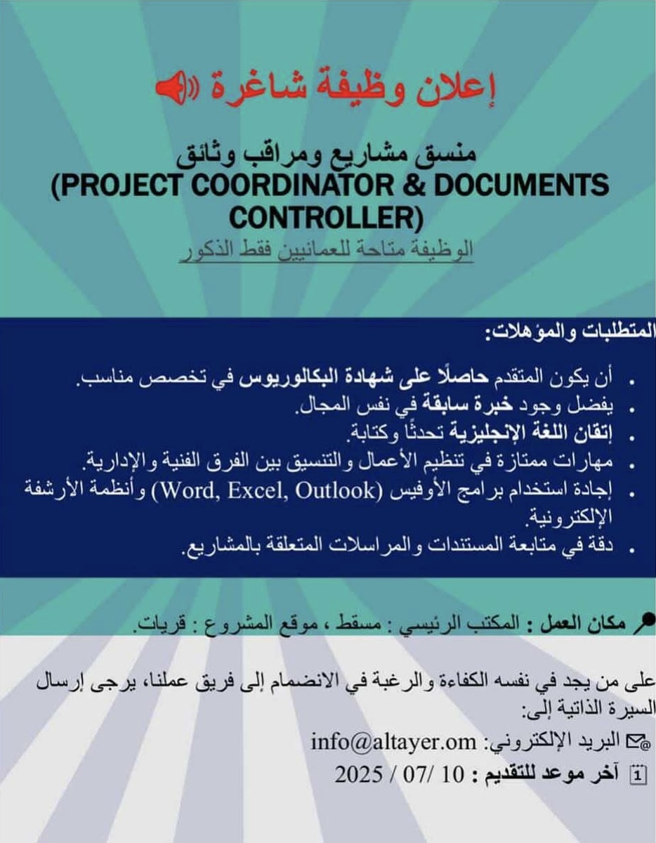 شركة الطاير للخدمات الهندسية في مسقط - وظيفة شاغرة ( منسق مشاريع ومراقب وثائق )