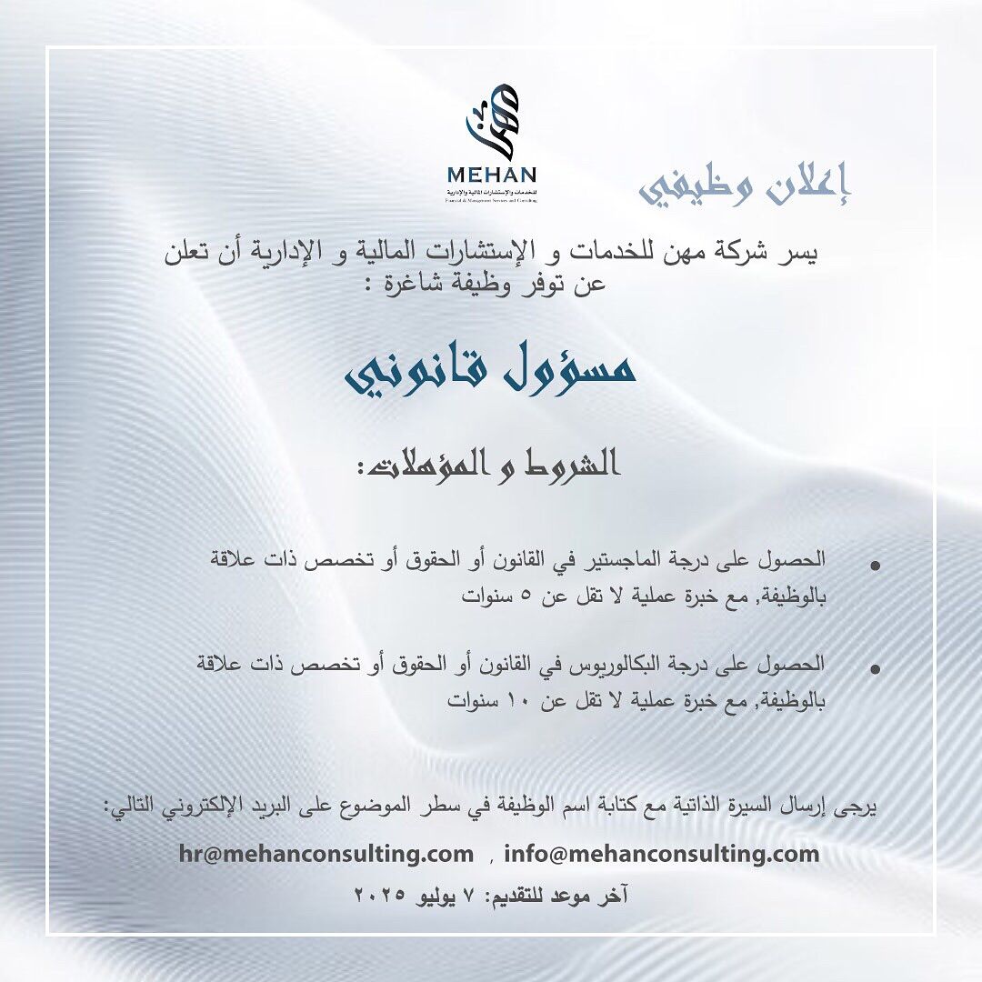 شركة مهن للخدمات والاستشارات المالية والإدارية - وظيفة شاغرة ( مسؤول قانوني )