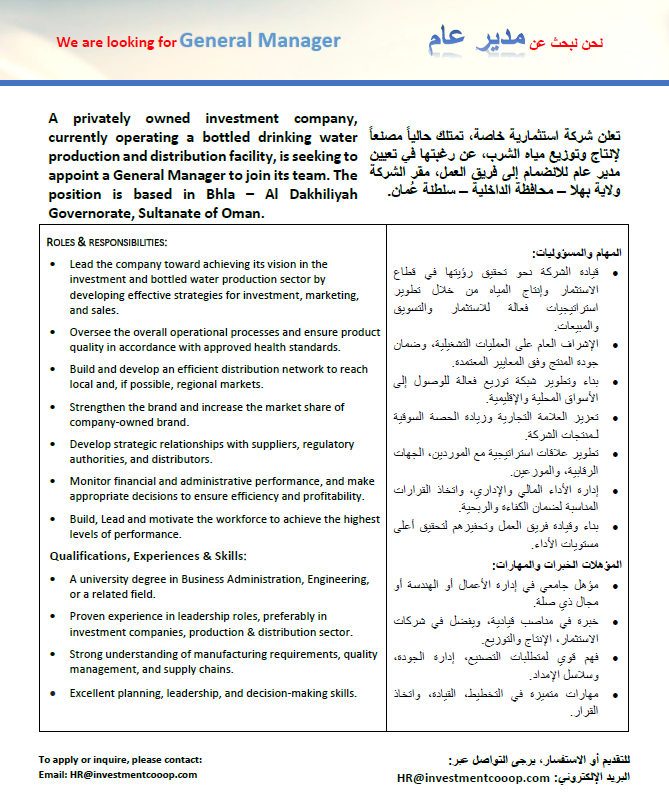 شركة تعاون للاستثمار في ولاية بهلا - وظيفة شاغرة ( مدير عام )