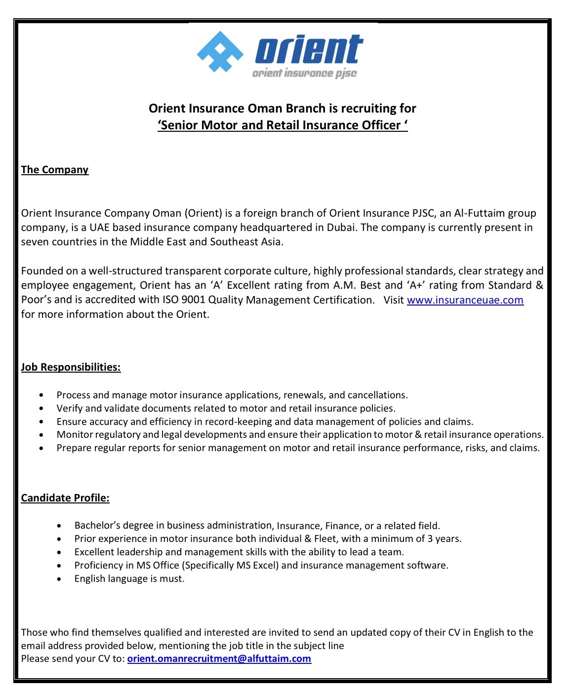 شركة أورينت للتأمين - وظيفة شاغرة ( 'Senior Motor and Retail Insurance Officer' )