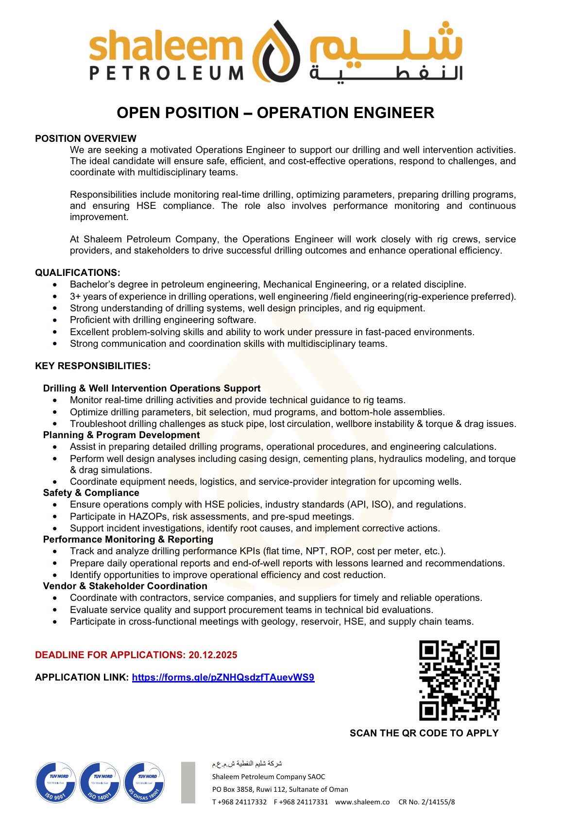 شركة شليم النفطية - وظيفة شاغرة ( مهندس عمليات )