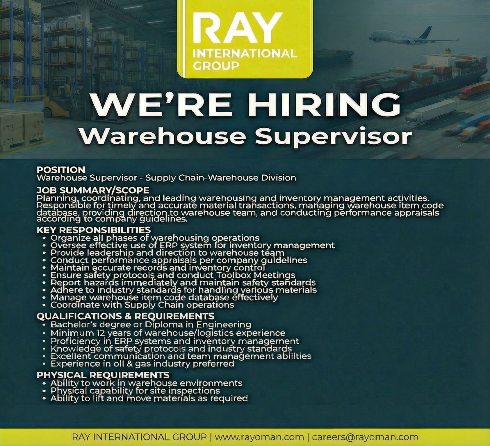 ركن اليقين العالمية - وظيفة شاغرة ( Warehouse Supervisor )