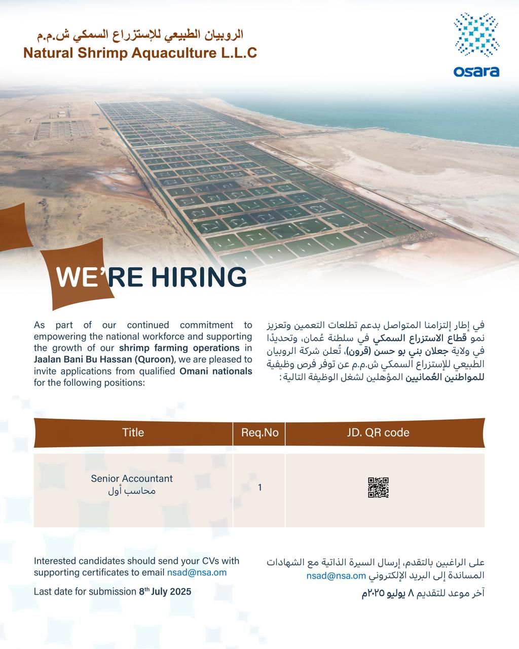 الروبيان الطبيعي للإستزراع السمكي في جعلان بني بو حسن - وظيفة شاغرة ( محاسب أول )