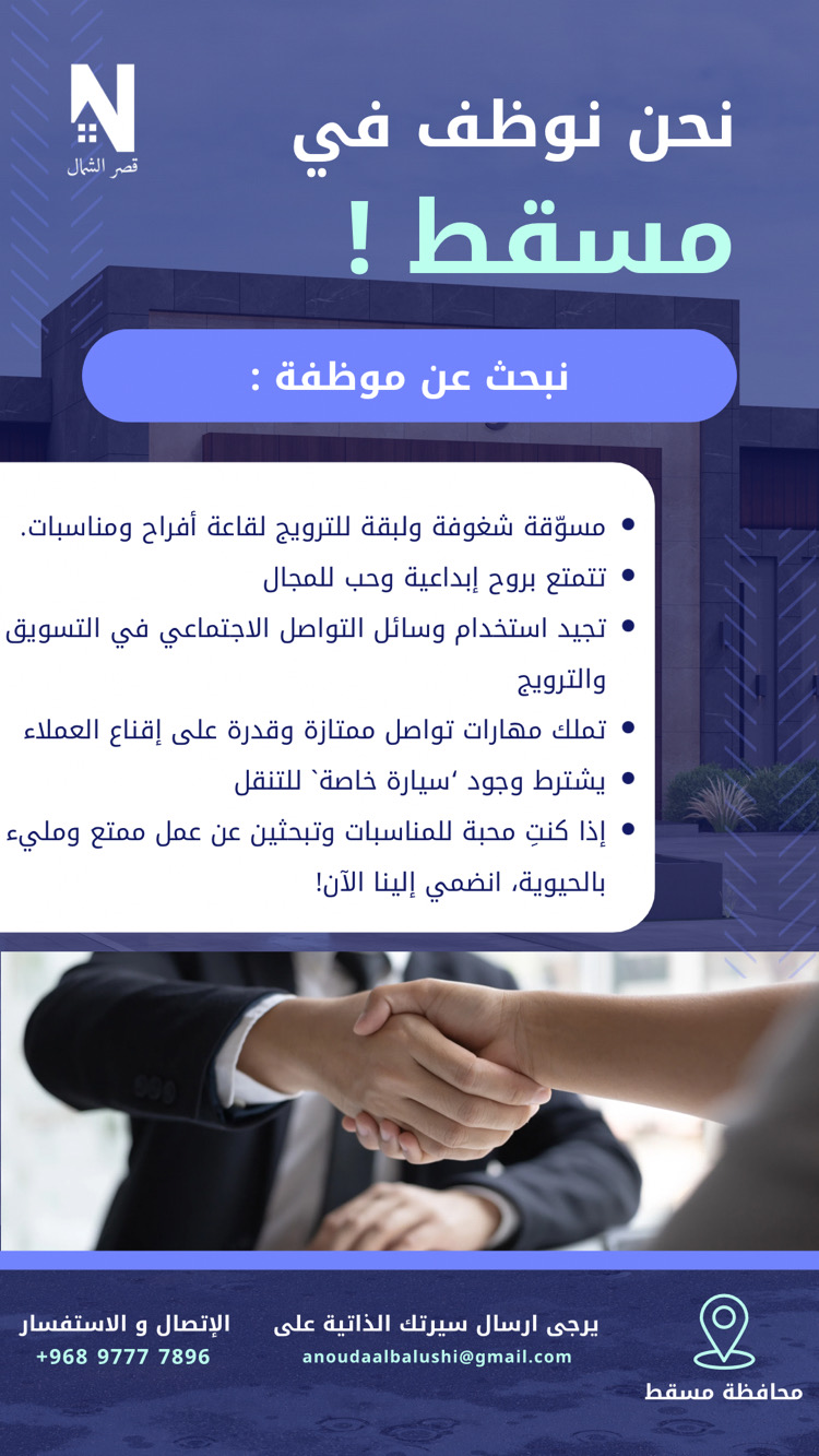 شركة قصر الشمال في مسقط - وظيفة شاغرة ( موظفة مسوقة )