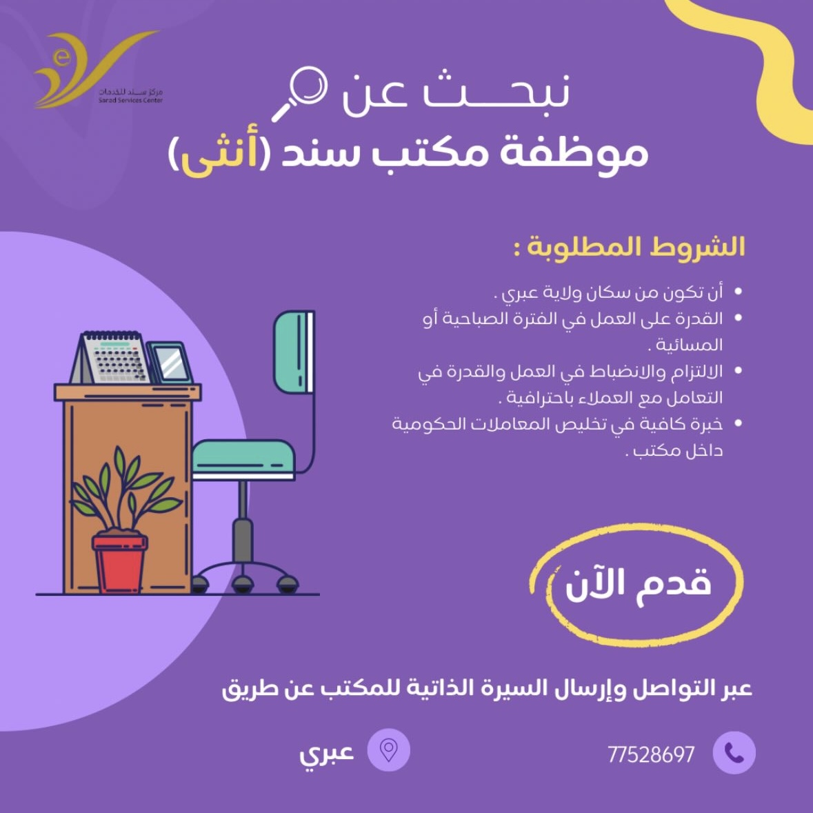 مكتب سند للخدمات في عبري - وظيفة شاغرة ( موظفة )