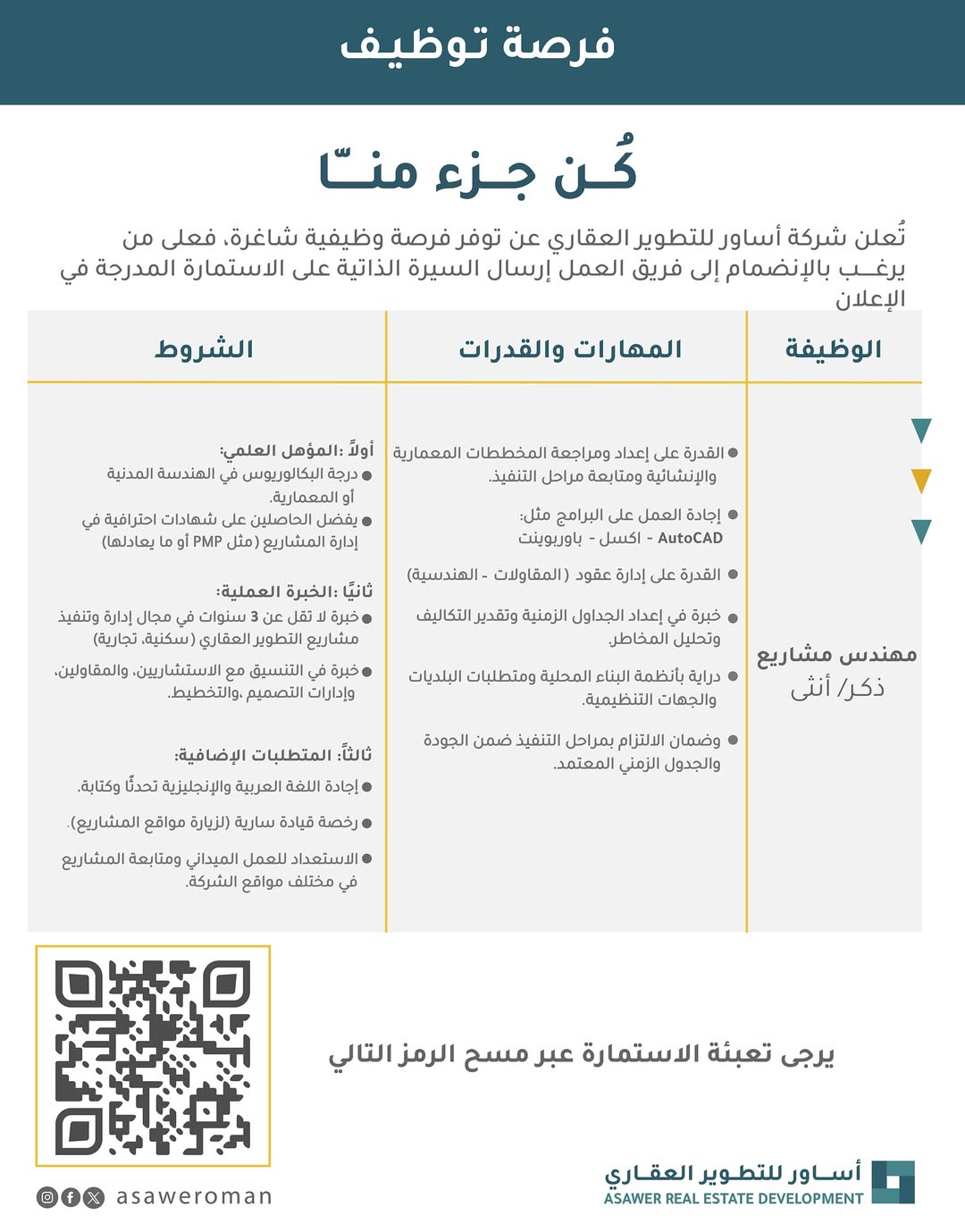 شركة أساور للتطوير العقاري - وظيفة شاغرة ( مهندس مشاريع )